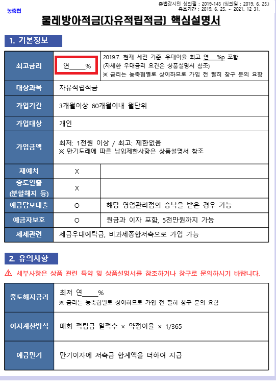 우대금리는 농ㆍ축협별로 다를 수 있으며 자세한 내용은 가입 영업점에 확인하시기 바랍니다.예금자보호이 예금은 '농업협동조합구조개선에관한법률'에 따라 1인당 최고 5,000만원까지 보호됩니다.(1인당 보호한도는 각 농·축협의 본점 및 지점의 예금을 합산합니다.)
