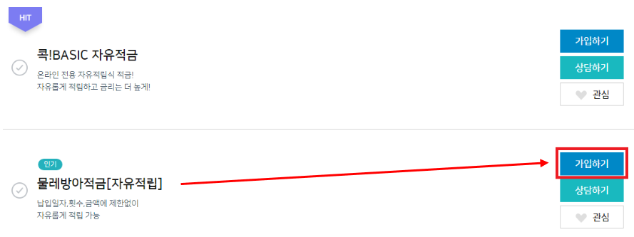 예금-> 목돈모으기(적금) 을 클릭하시면 해당 화면이 등장합니다.