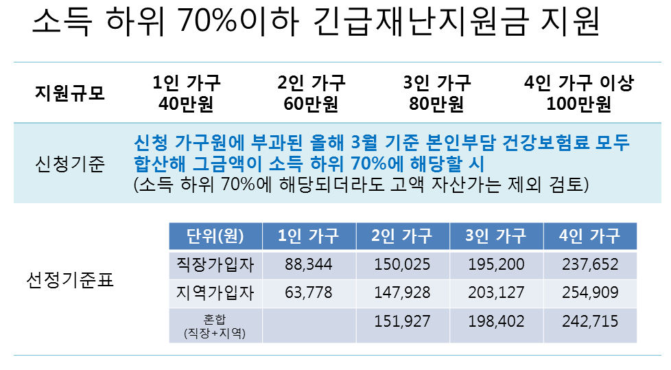 정부가 3월 건강보험료를 기준으로 소득 하위 70% 가구에 긴급재난지원금을 지급하는데 이 기준이 3월 기준 본인부담건강보험료를 기준으로 지정한다고합니다.